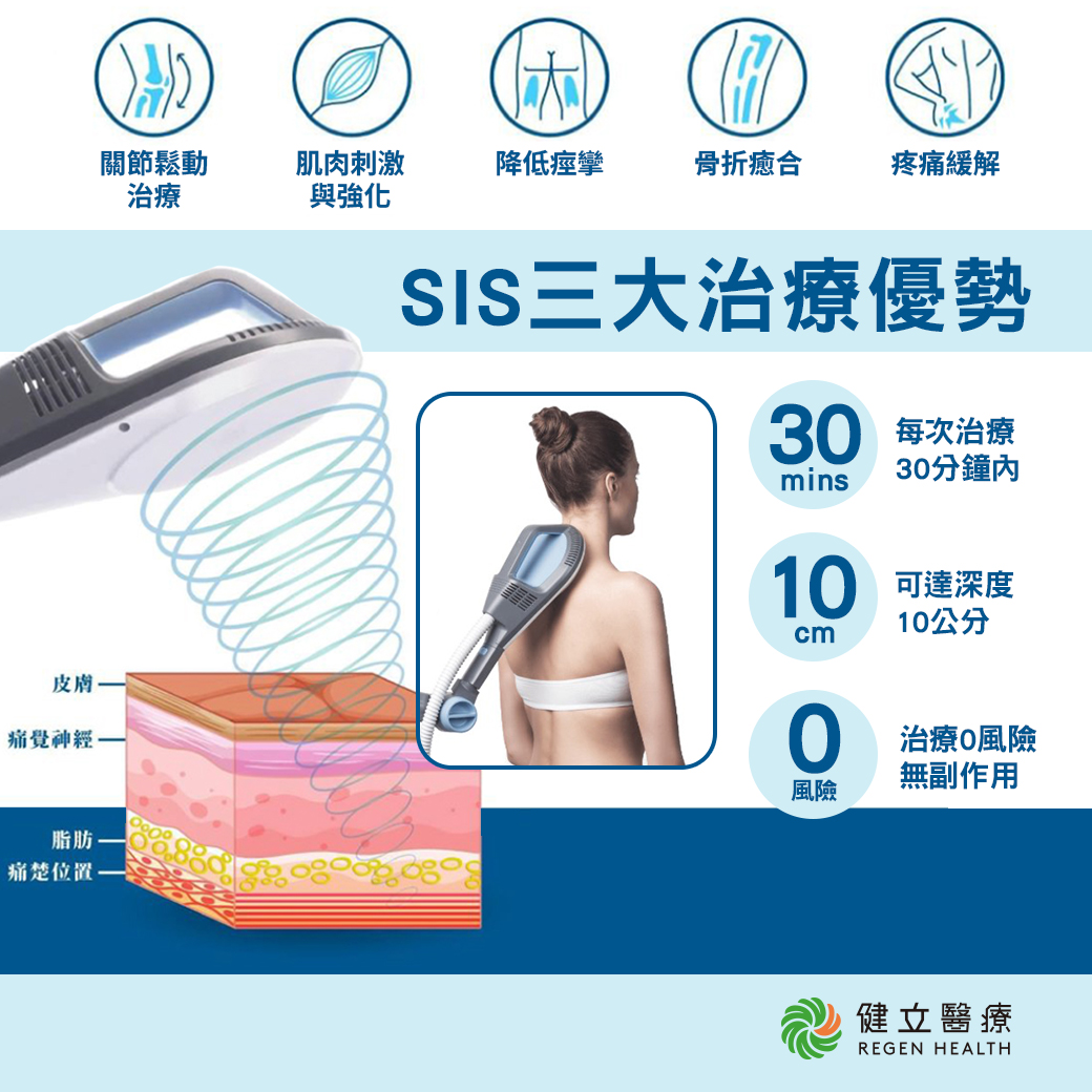 SIS超磁能治療儀能深達10公分組織層精準治療,通過放鬆和強化肌肉即時舒緩疼痛感。