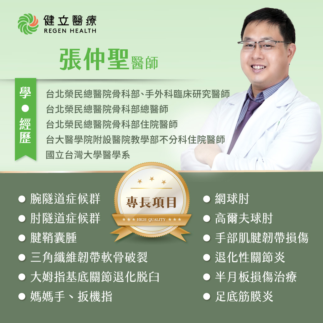 張仲聖醫師曾於台灣大學醫學院附設醫院、台北榮民總醫院骨科部歷經住院醫師、總醫師、手外科臨床研究醫師的完整訓練。張醫師臨床經驗深厚,特別專精於肘腕關節疾病與肌腱軟組織治療,以精準診斷與先進療法,幫助病人恢復手部靈活與生活品質。