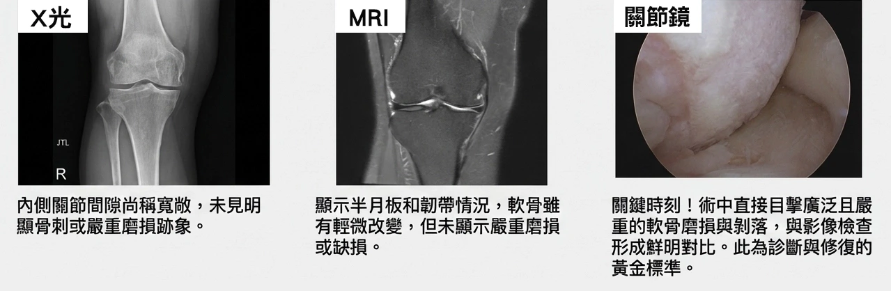 | 是否能直接治療? | ✘ 無法治療,只能提供影像判讀。 | ✔ 可同步修補(半月板、軟骨、韌帶、削骨、清創等) |