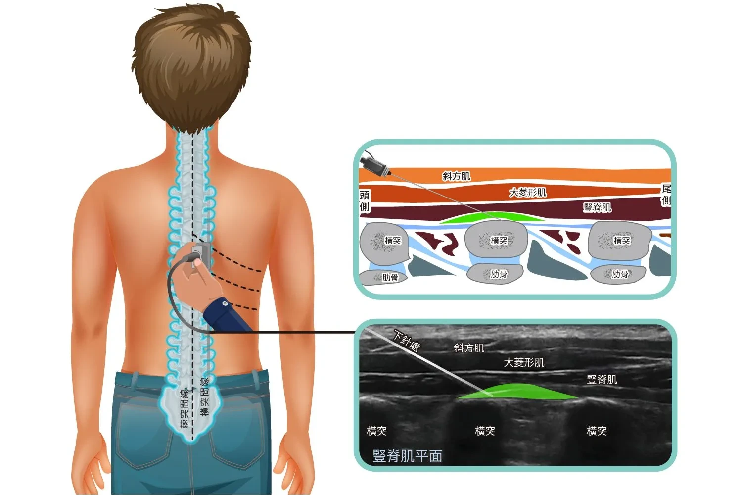 豎脊肌平面阻斷術(ESP Block)是一種在超音波導引下進行的精準止痛注射。醫師會將局部麻醉藥或合併少量類固醇,注射於「豎脊肌深層、椎骨橫突上方」的筋膜平面。這個平面就像一條「神經傳導高速公路」,藥液可順著筋膜間隙廣泛擴散,減少神經發炎與疼痛傳導。