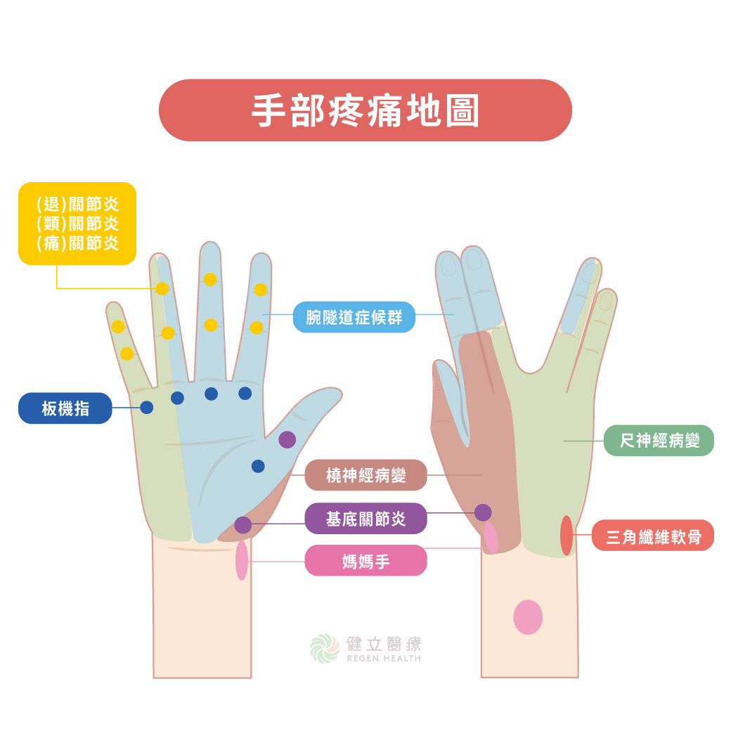 手部疼痛的症狀容易讓人混淆? 一圖看懂媽媽手、扳機指、腕隧道症候群等問題的差異!
