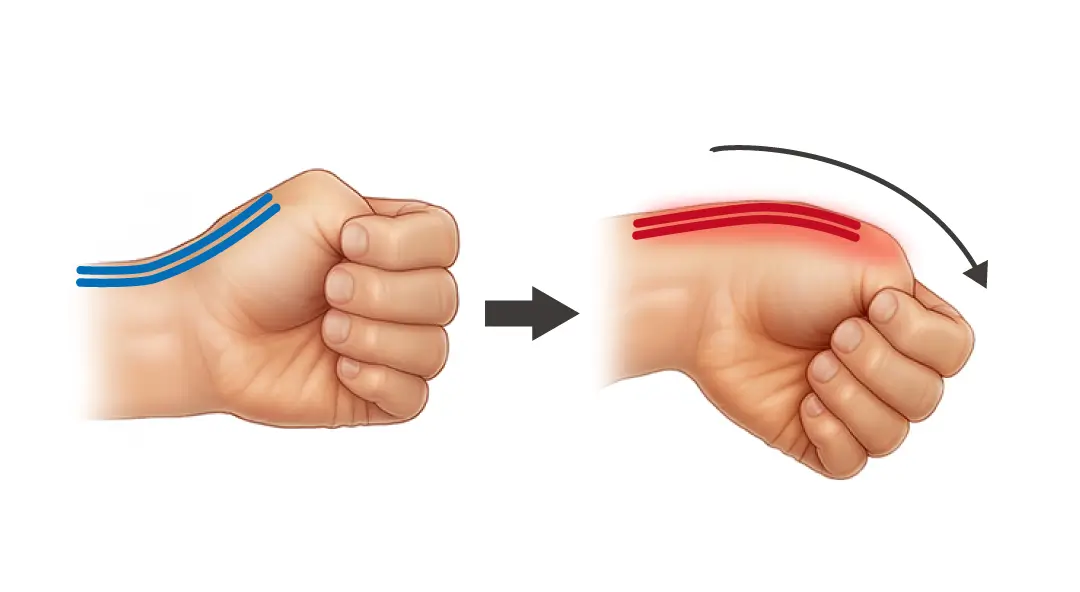 此病症發生於手腕橈側(拇指側)的「第一伸肌腱鞘室」。當其中的伸拇短肌 (EPB) 與 外展拇長肌 (APL) 因反覆摩擦導致腱鞘發炎、腫脹並變得狹窄時,肌腱滑動受阻,進而引發劇烈疼痛與功能障礙。